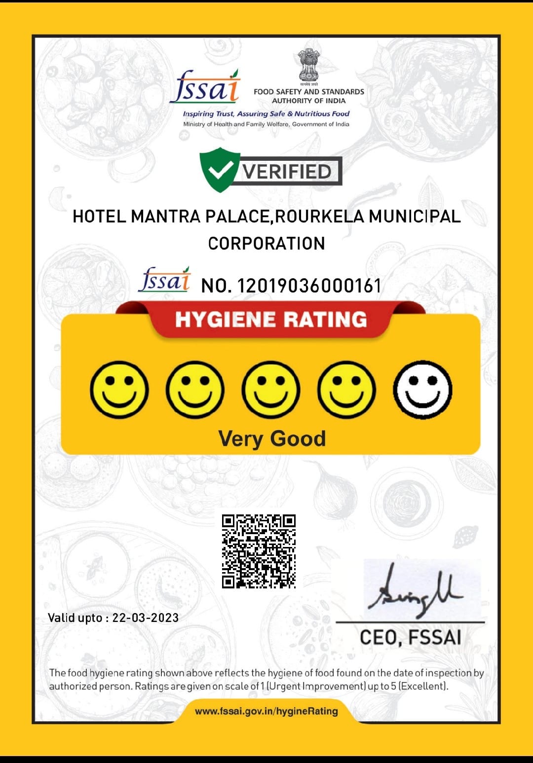 Vyanjan is certified by FSSAI (Food Safety and Standards Authority of India) under the Rourkela Municipal Corporation with a "Very Good" hygiene rating — a testament to our commitment to safe, clean, and nutritious food.
